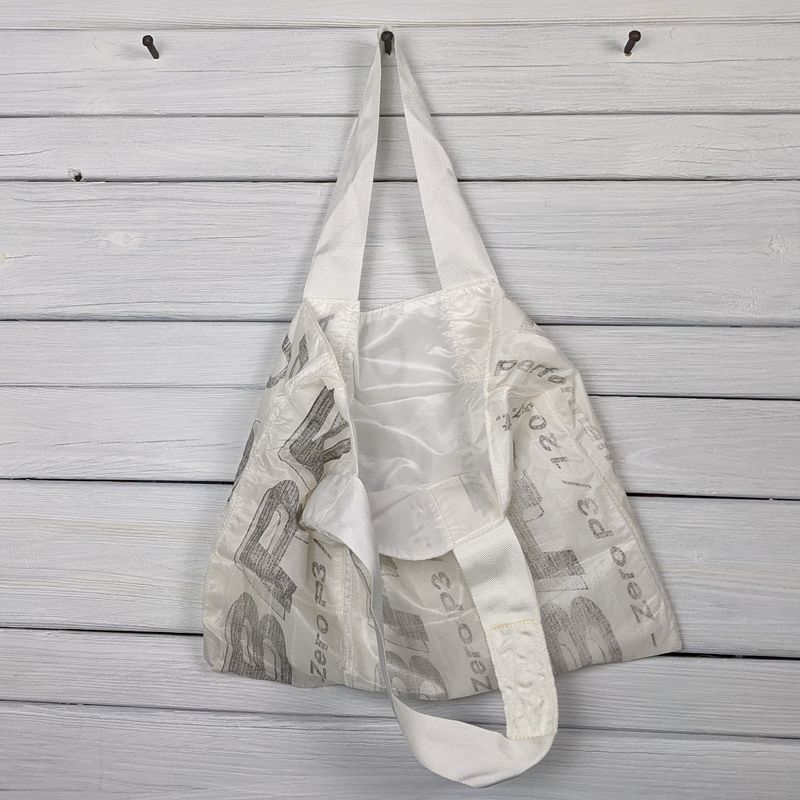 This bag is made from three reclaimed sabre parachute logos, lined with white ripstop.