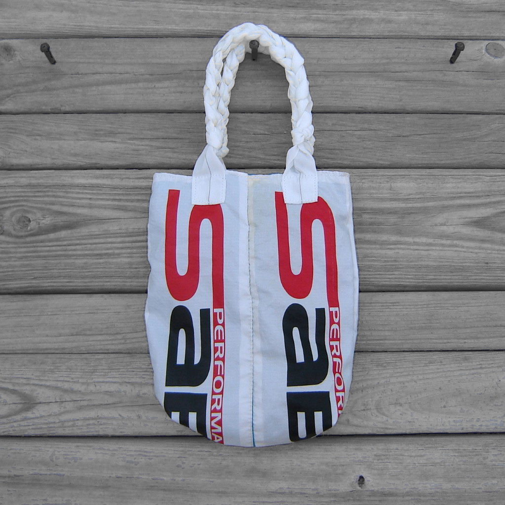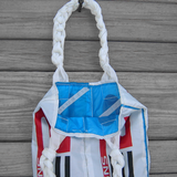 This bag is made from two Sabre2 logo labels and the water resistant zero porosity marine blue parachute end panels they were sewn on to. The handles are crocheted white nylon webbing. The bag is lightweight, durable, washable .