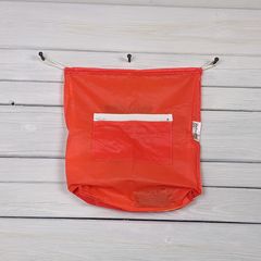 This drawstring backpack is made from part of an orange parachute with a warning label. There is a zippered interior pocket; the white drawstrings are nylon and their length is adjustable.
