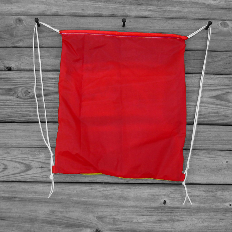 A neon yellow end panel with a Katana parachute logo label was reclaimed from a parachute no longer in service and appliqued on to a red drawstring backpack.