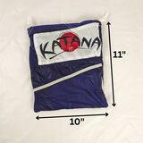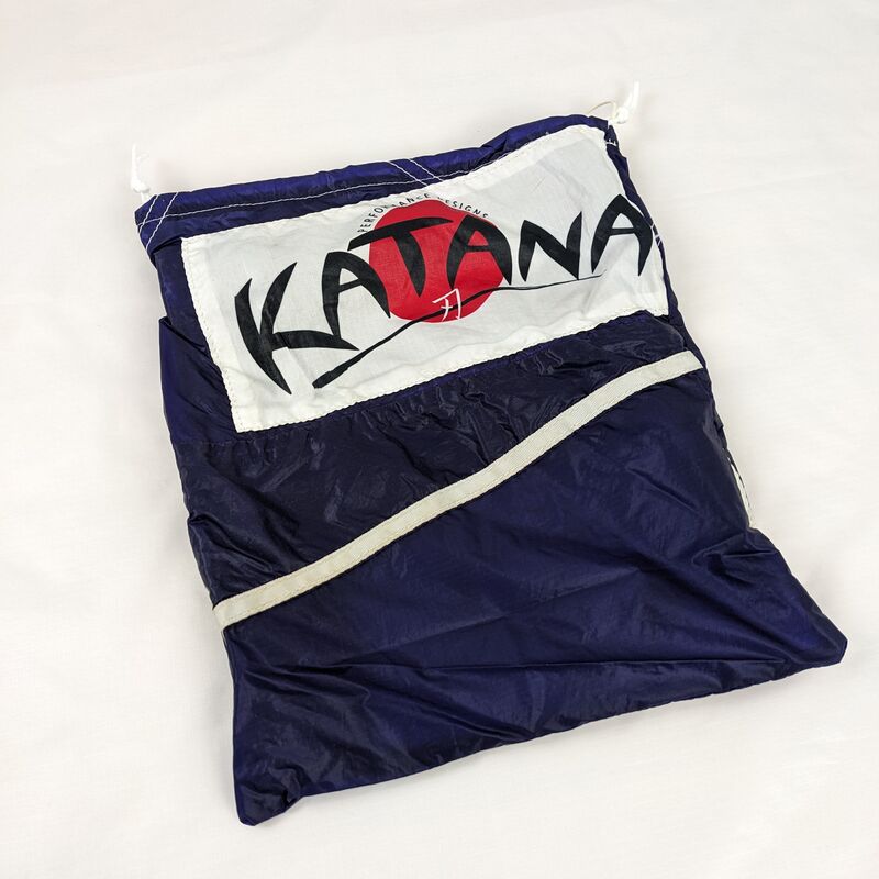 A water resistant drawstring pouch made from parachute end panels with Katana logo labels. The drawstrings are white nylon shoelace material.