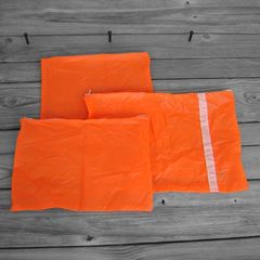 Part of a parachute repurposed into three neon orange zippered pouches, each a single layer of water resistant zero porosity ripstop nylon. White nylon YKK zippers. Organize your stuff.